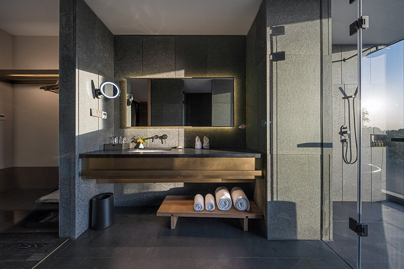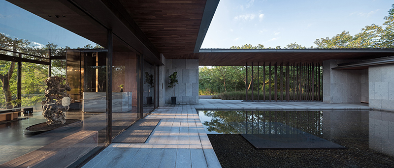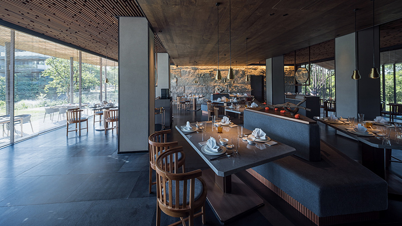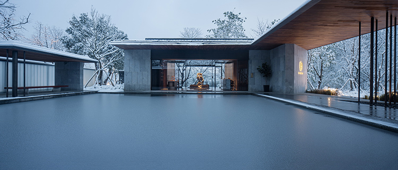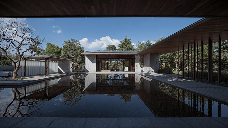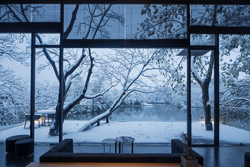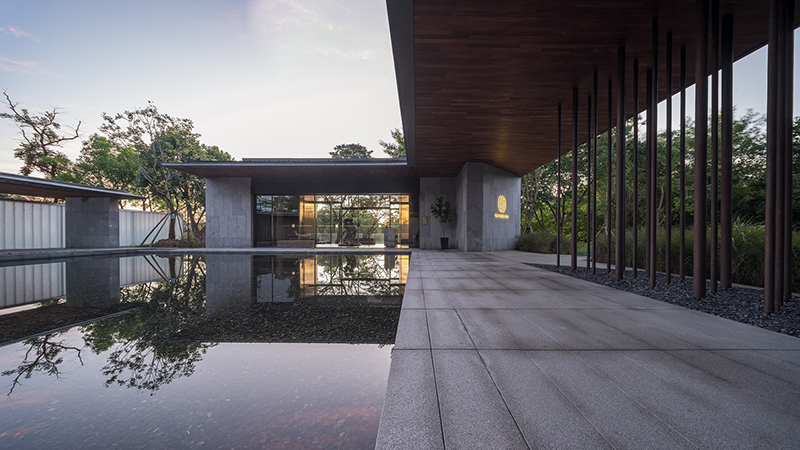 酒店功能布局因地制宜,入口一爿琴台与柿树静立于水院中央,以水平线条连接东侧视野开阔的“野堂”与西侧的回廊。