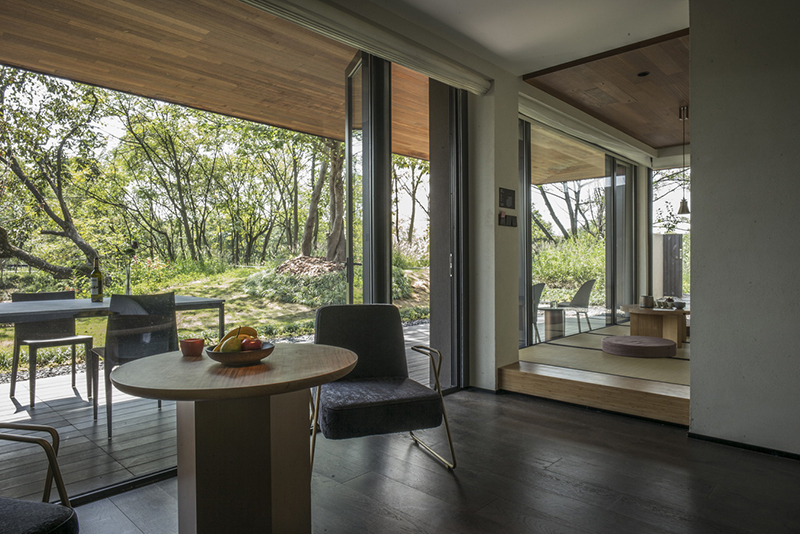 酒店由场地中原有的5栋旧建筑改造而来。如何以生态性最优的方式满足现代酒店的使用需求是建筑师面临的挑战。经过大量的现场调研,建筑师以极小规模的介入完成了结构改造和综合系统布局,使建筑与周边的林木、水系的关系得以延续。