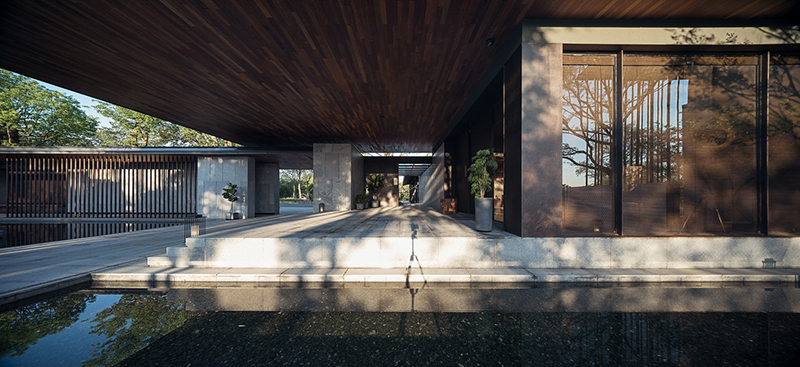 回廊以二度回收的老木板、锈化钢及水冲面大理石作为主材,设计师借此将“时间”的概念引入空间——当材料的原始色泽和触感在风霜雪雨中缓慢演变,时间的流逝也便记录在空间的一石一木之中。