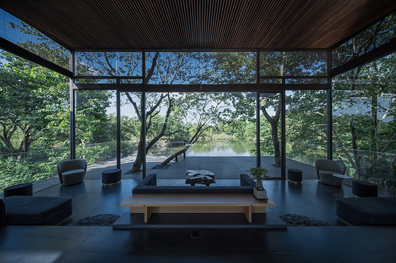 全明宴会厅采用270°落地玻璃,逾300㎡室内空间与户外密林、草坪及亲水木平台自然交融,也为在此举办的宴会、服装秀、车展等活动营造出独特的林间体验。