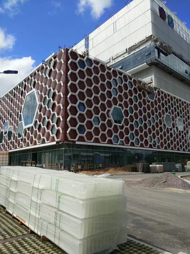 蜂巢状玻璃幕墙的设计灵感来源于蜜蜂把花粉酿蜜的过程。设计师把每天奔波在城市中的众多垃圾回收车辆比喻蜜蜂收集花粉的过程,把生活垃圾焚烧发电厂比喻蜂巢,将收集的生活垃圾在焚烧发电厂变成清洁能源的过程比喻蜜蜂酿蜜,非常形象的展现了康恒宁波鄞州垃圾焚烧发电厂的建造理念。