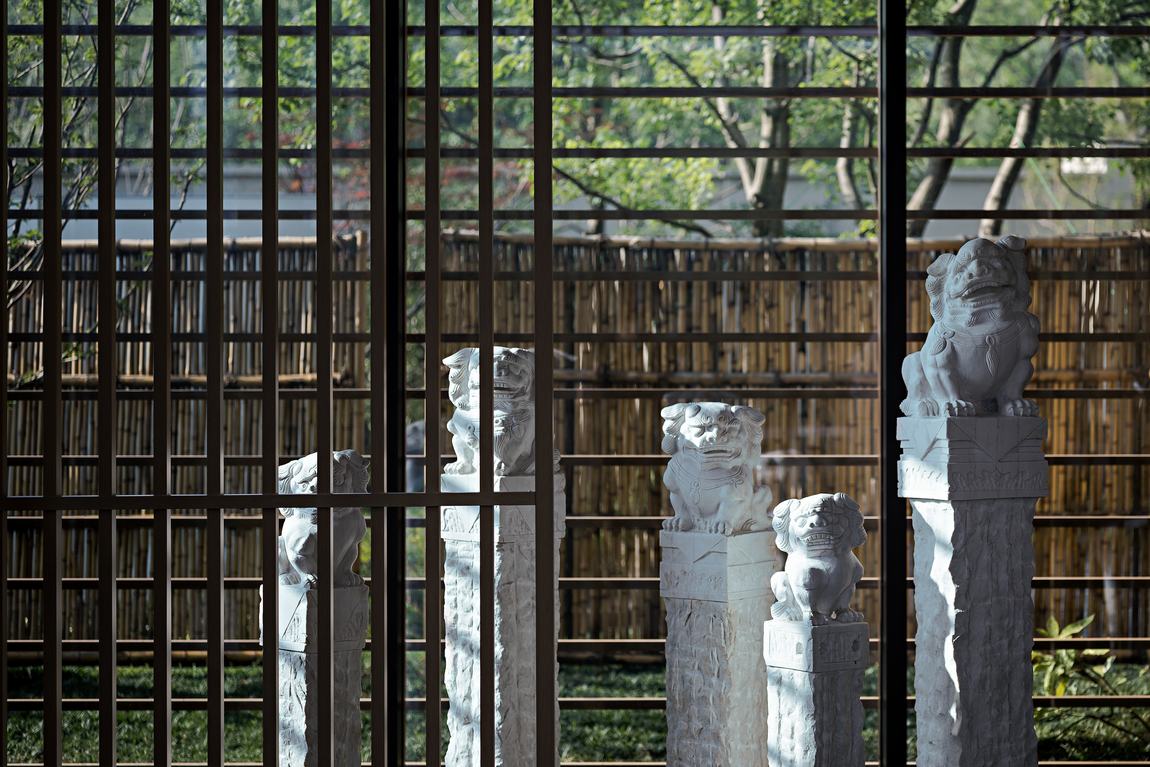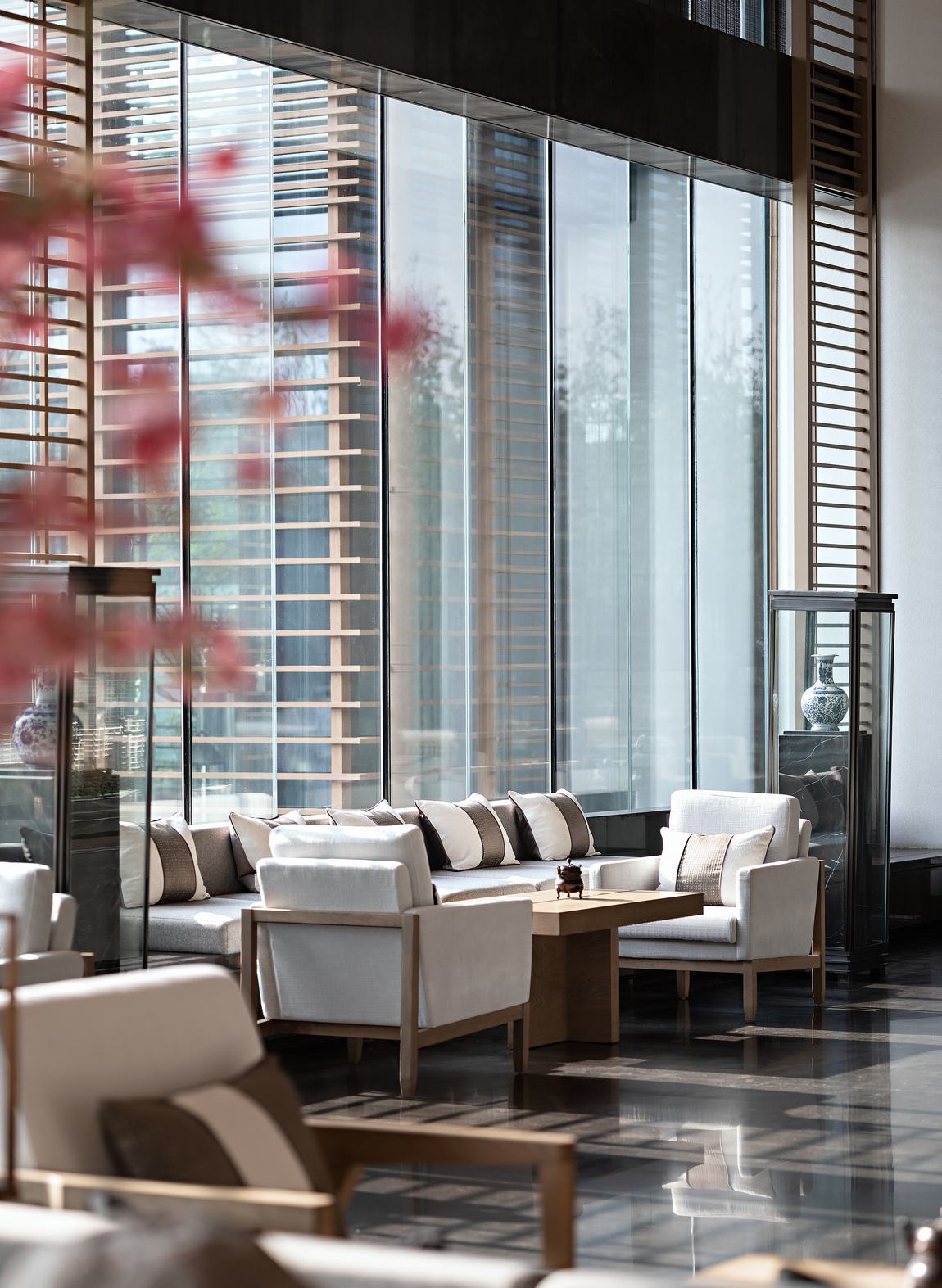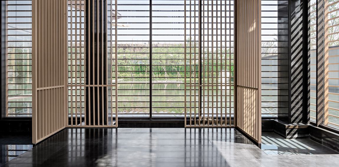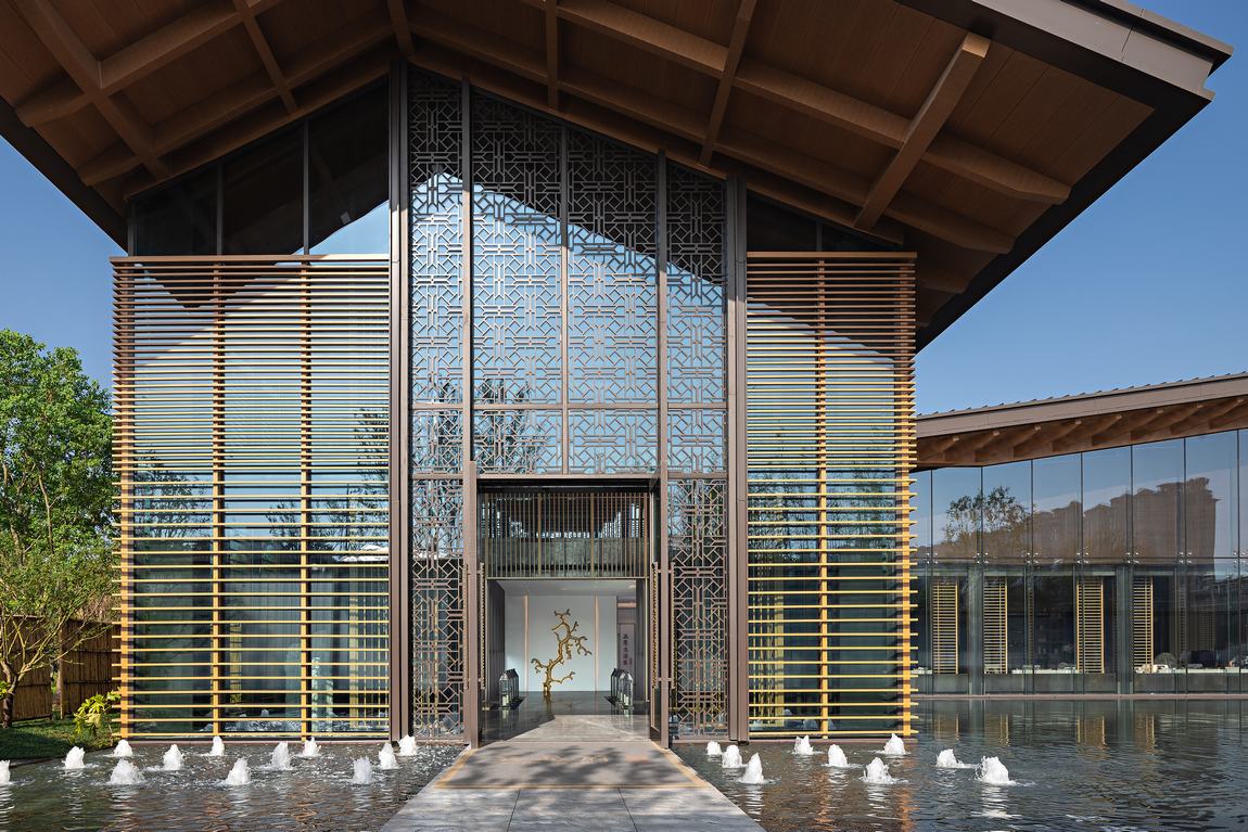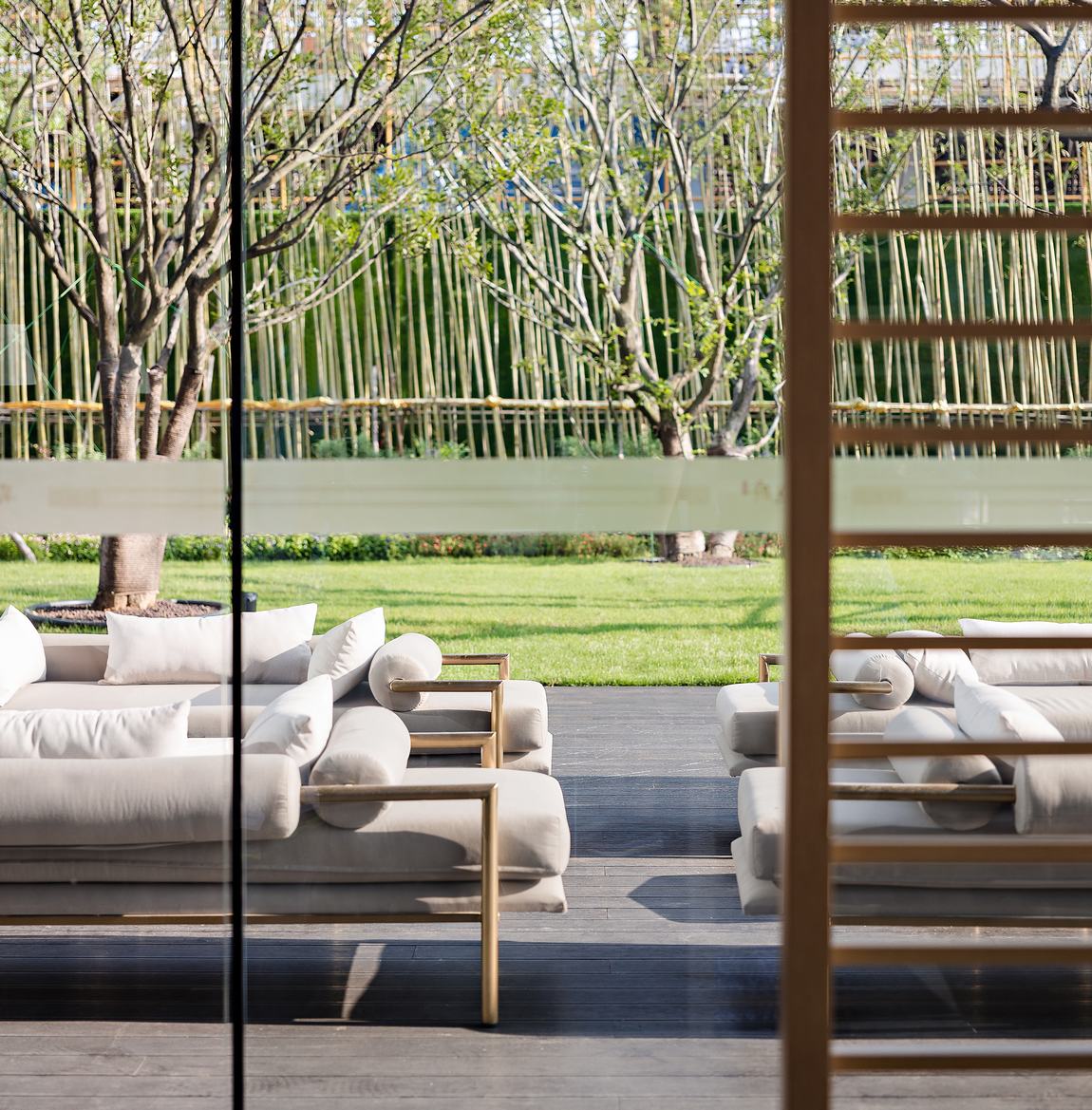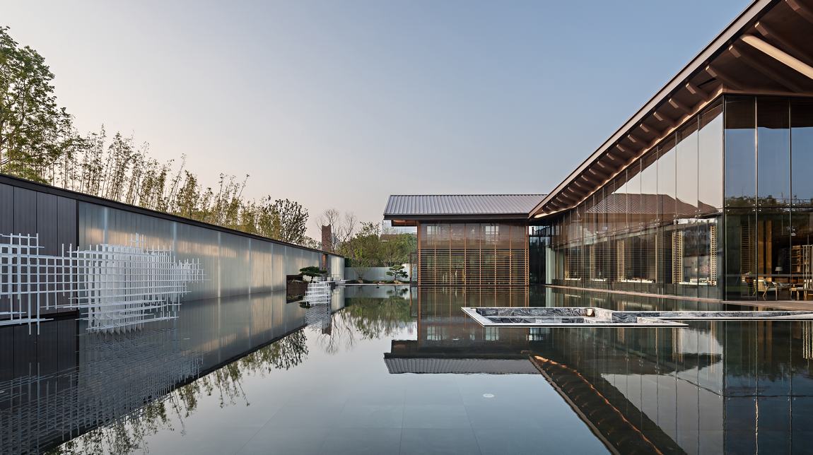 透明朦胧的连廊,是物理意义上功能的贯穿,也承载着精神世界里的虚实相生,让人流连停驻下脚步的,是眼前的潋滟水色,也有吴越地域历史隐约透露出的意境情韵。青砖异石、翠竹青松、以及雅致的中式园林端景小品,营造出典雅幽静的氛围,移步易景,情随景生,建筑、自然与人随处发生着互动。