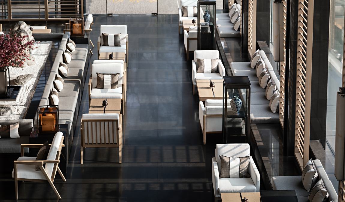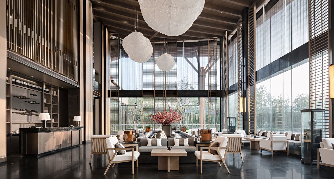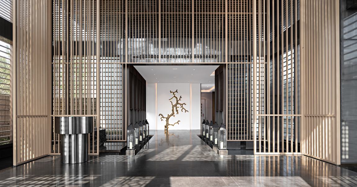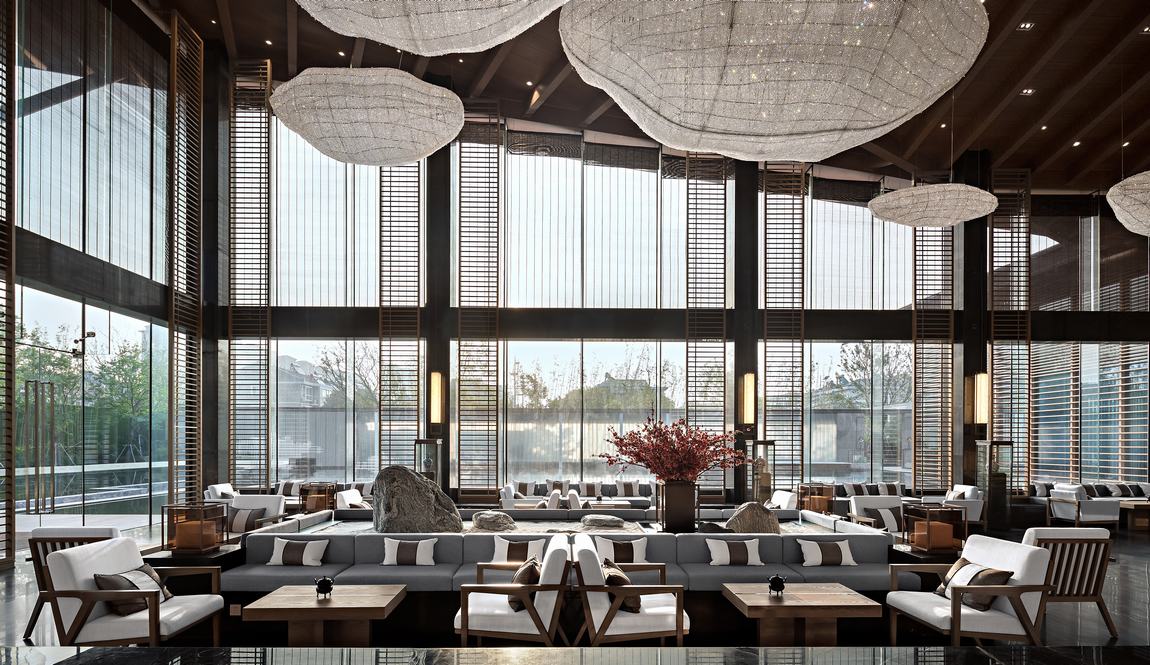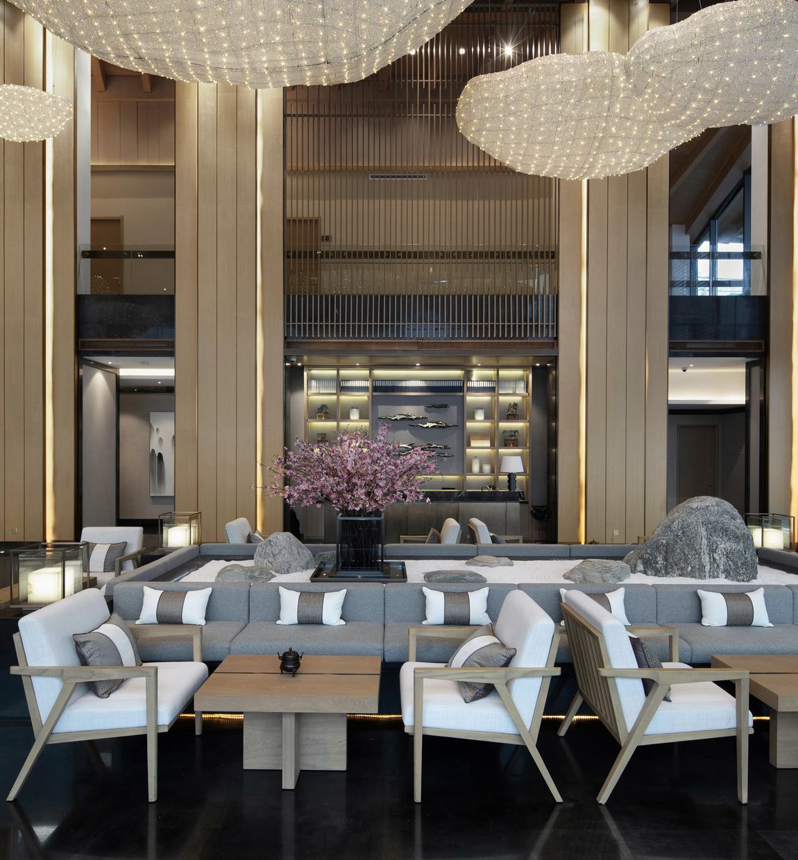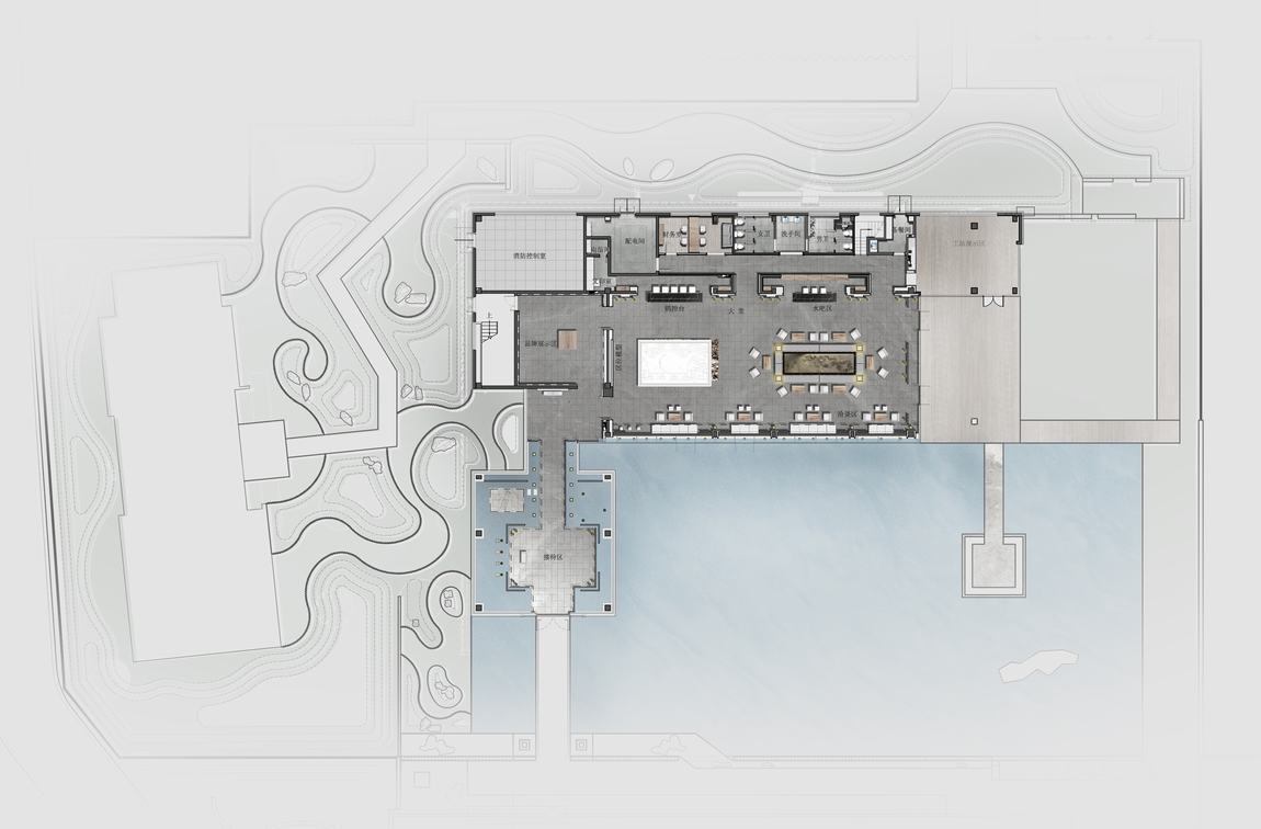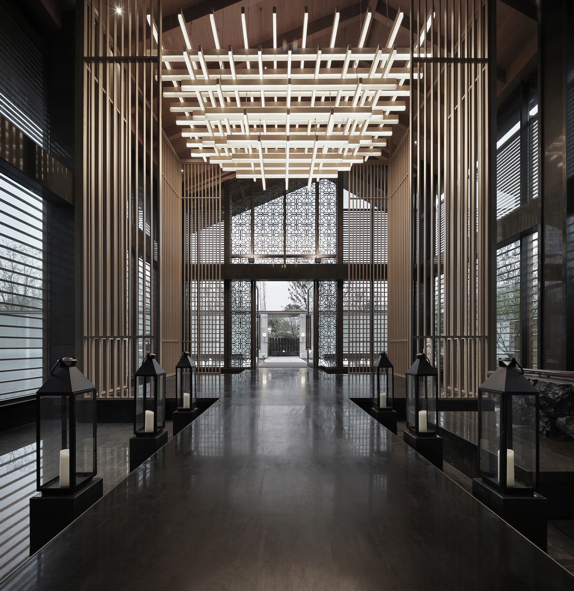 透明朦胧的连廊,是物理意义上功能的贯穿,也承载着精神世界里的虚实相生,让人流连停驻下脚步的,是眼前的潋滟水色,也有吴越地域历史隐约透露出的意境情韵。青砖异石、翠竹青松、以及雅致的中式园林端景小品,营造出典雅幽静的氛围,移步易景,情随景生,建筑、自然与人随处发生着互动。