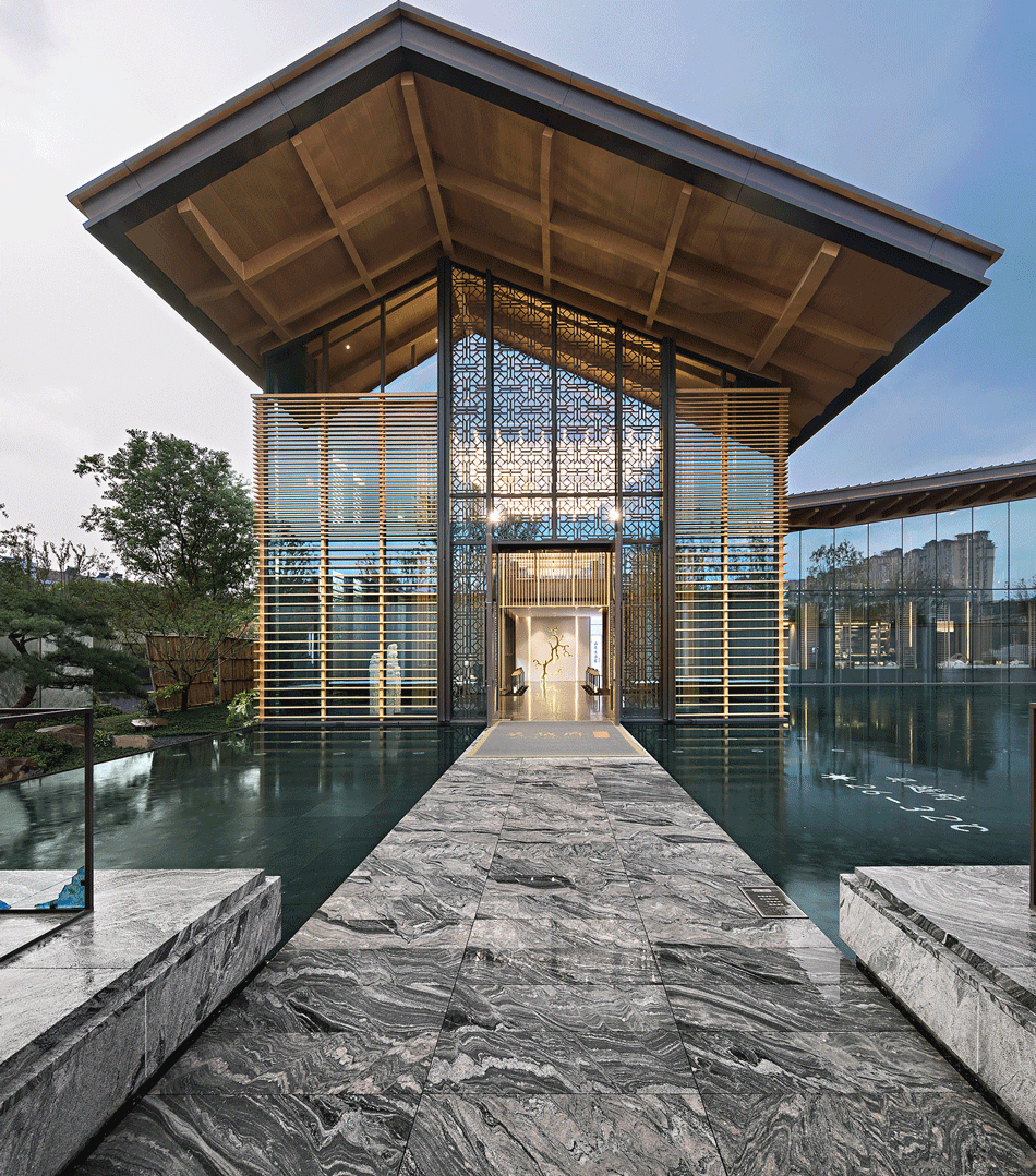回溯一千多年前,在江南逐渐成为全国经济重心的唐宋时期,文人雅士既有“府中连骑出,江上待潮观”的壮逸之气,也有“野鸟游鱼信往还,此身同寄水云间”的悠远之境。而在当代,都市生活亦需要有入则宁静,出入繁华的自由。吴越府销售中心即通过设计之手,重新调节了人与外部环境之间的尺度。