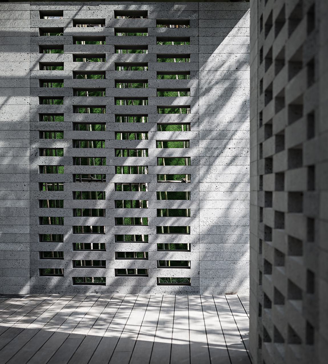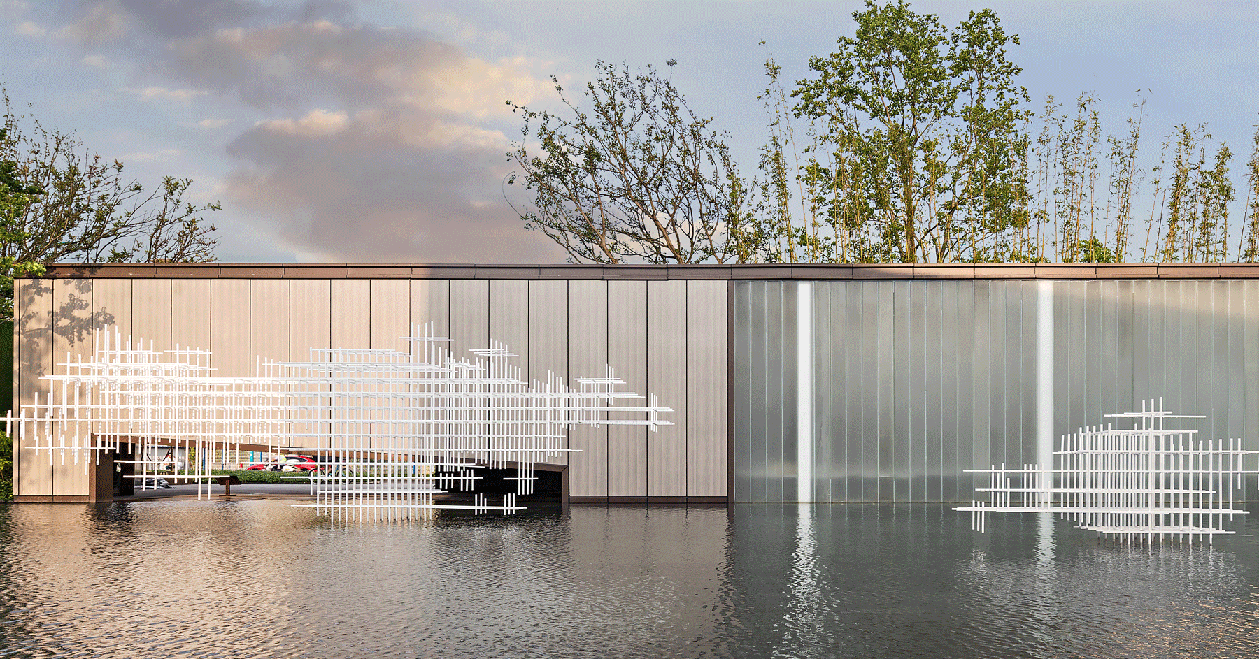 艺术家从无界的时空痕迹里捕捉灵感,设计师基于骨子里的东方人文基因,提取淬炼出对中式经典美学的赞美与传承。坡屋顶是中国传统建筑的代表元素,尚石设计在这个空间里用建筑的手法打造了室内水榭,以人文诗意的精神联动室内外,为空间赋予了更丰富的文化特性。铝格栅装置让室内外依然保持互动,呈现出自然通透的空间感。