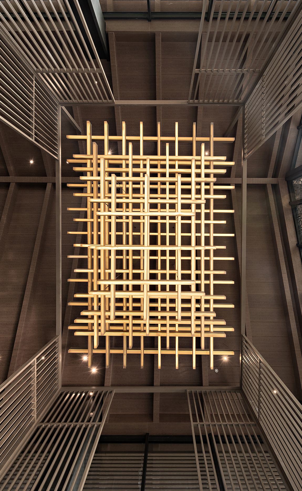 天花上以斗拱为原型的灯光装置无可避免地吸引住众人目光,从传统建筑元素幻化而成的艺术装置里,柔和光源透过亚克力散发出迷人光芒。