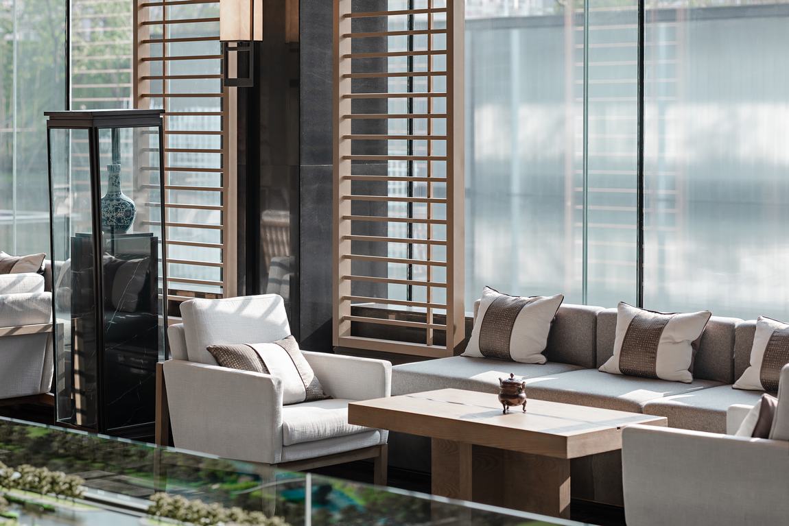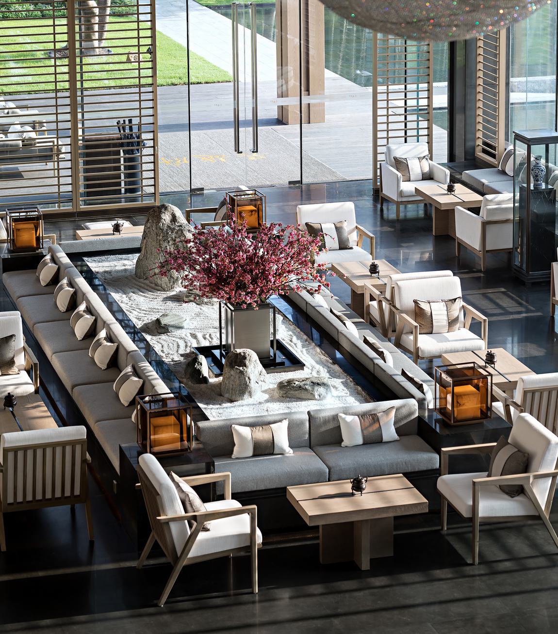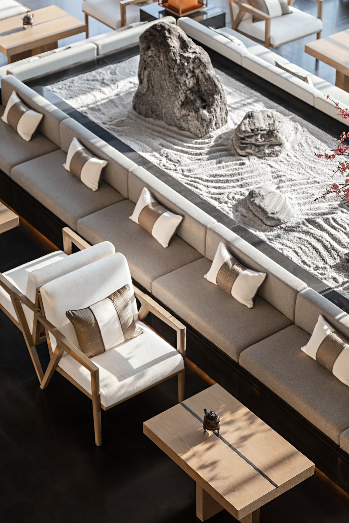 营造静谧自然意境,设计当做减法。以空间中央的枯山水为中心,几组自然质朴的家具形成洽谈场景空间。在靠窗的位置,来访的客人面山背水而坐,心生亲切。青花瓷、小香炉适当点缀,并无过多装饰。从室内行至室外,一组下沉式的户外沙发深入无边界的水景中,浑然一体,宛若行舟至此,与俗世隔绝,只待静静感受大自然的魅力。