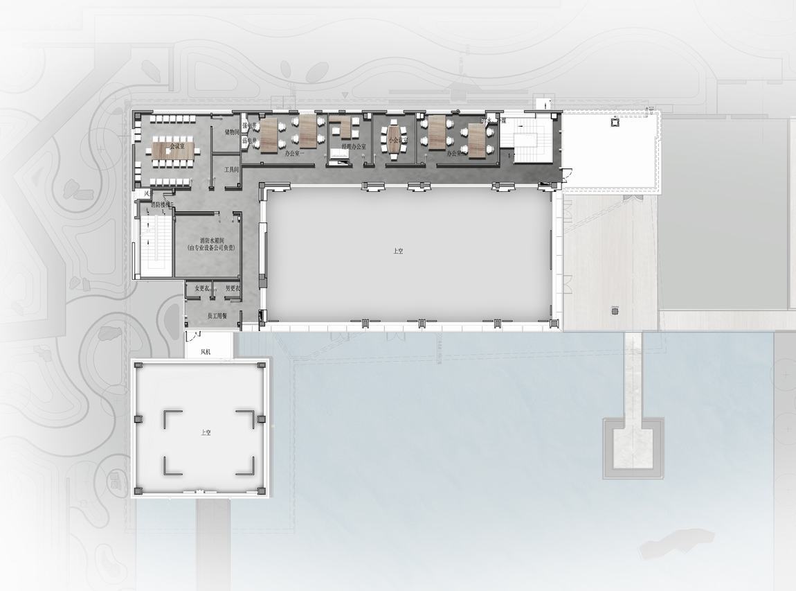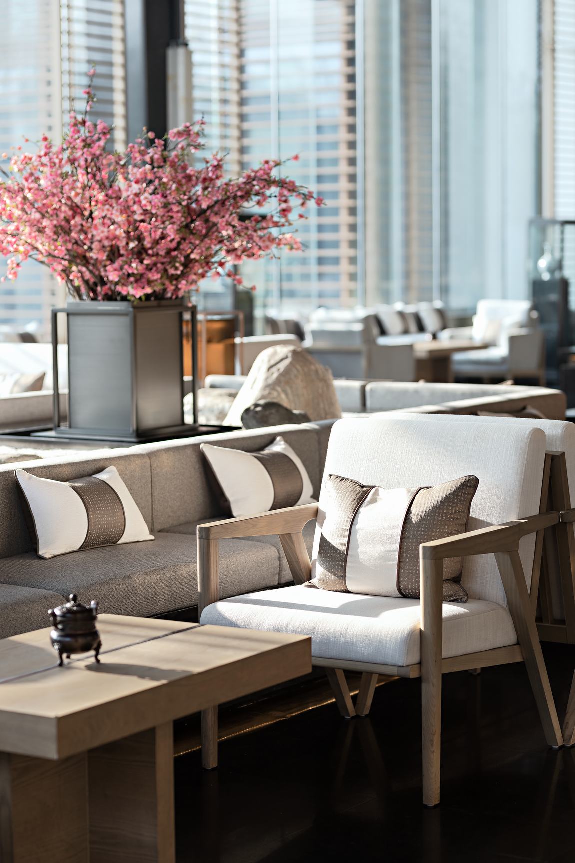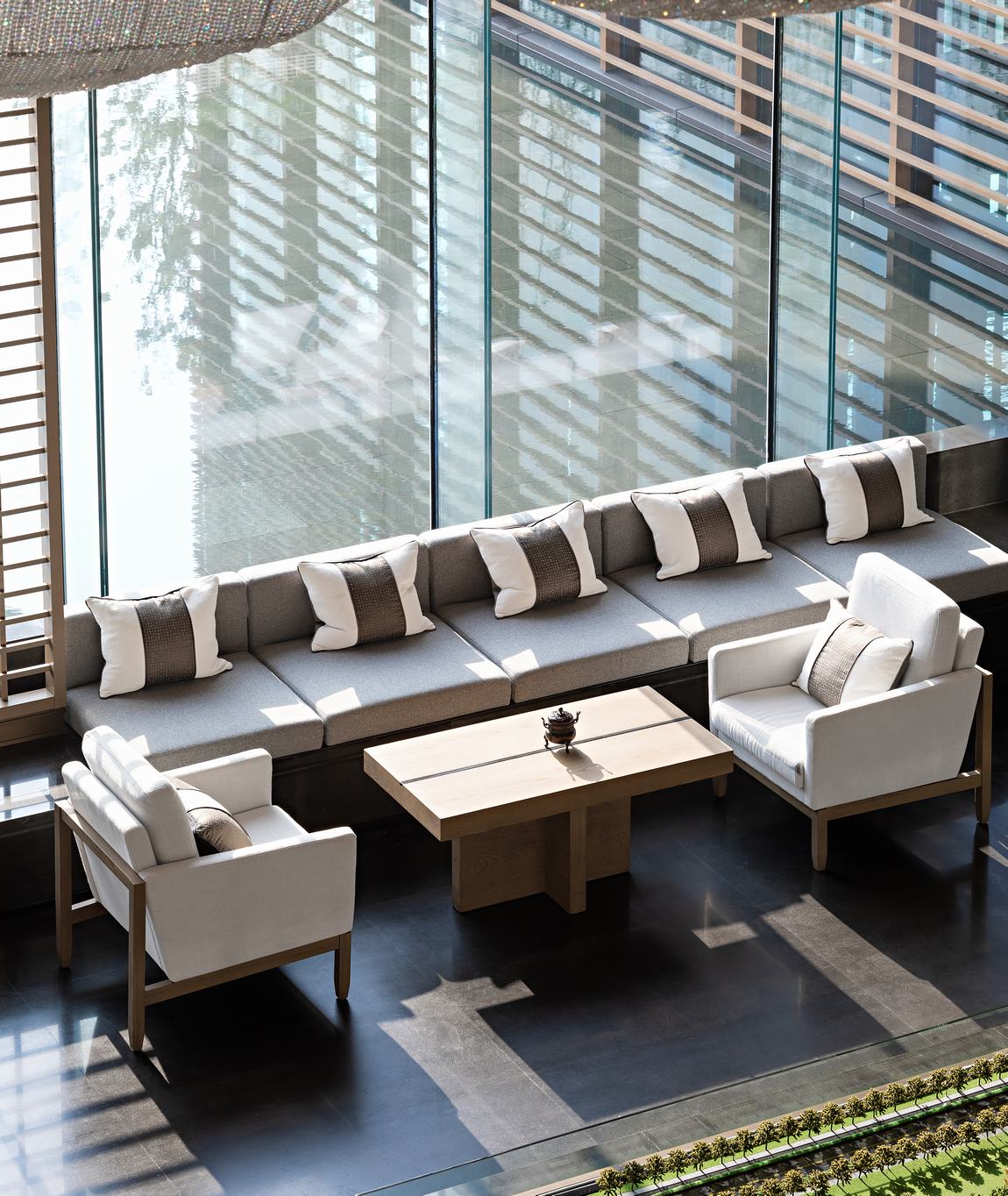 营造静谧自然意境,设计当做减法。以空间中央的枯山水为中心,几组自然质朴的家具形成洽谈场景空间。在靠窗的位置,来访的客人面山背水而坐,心生亲切。青花瓷、小香炉适当点缀,并无过多装饰。从室内行至室外,一组下沉式的户外沙发深入无边界的水景中,浑然一体,宛若行舟至此,与俗世隔绝,只待静静感受大自然的魅力。
